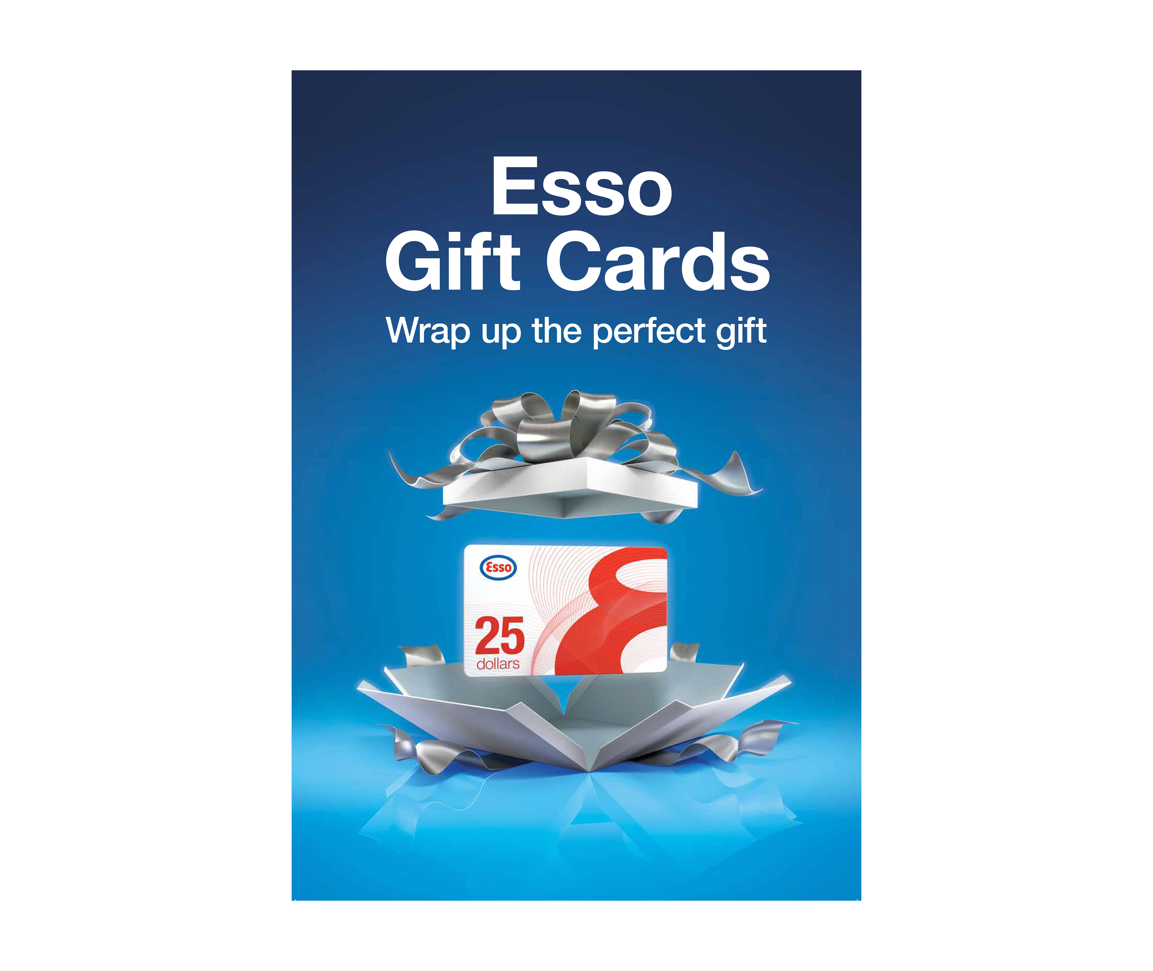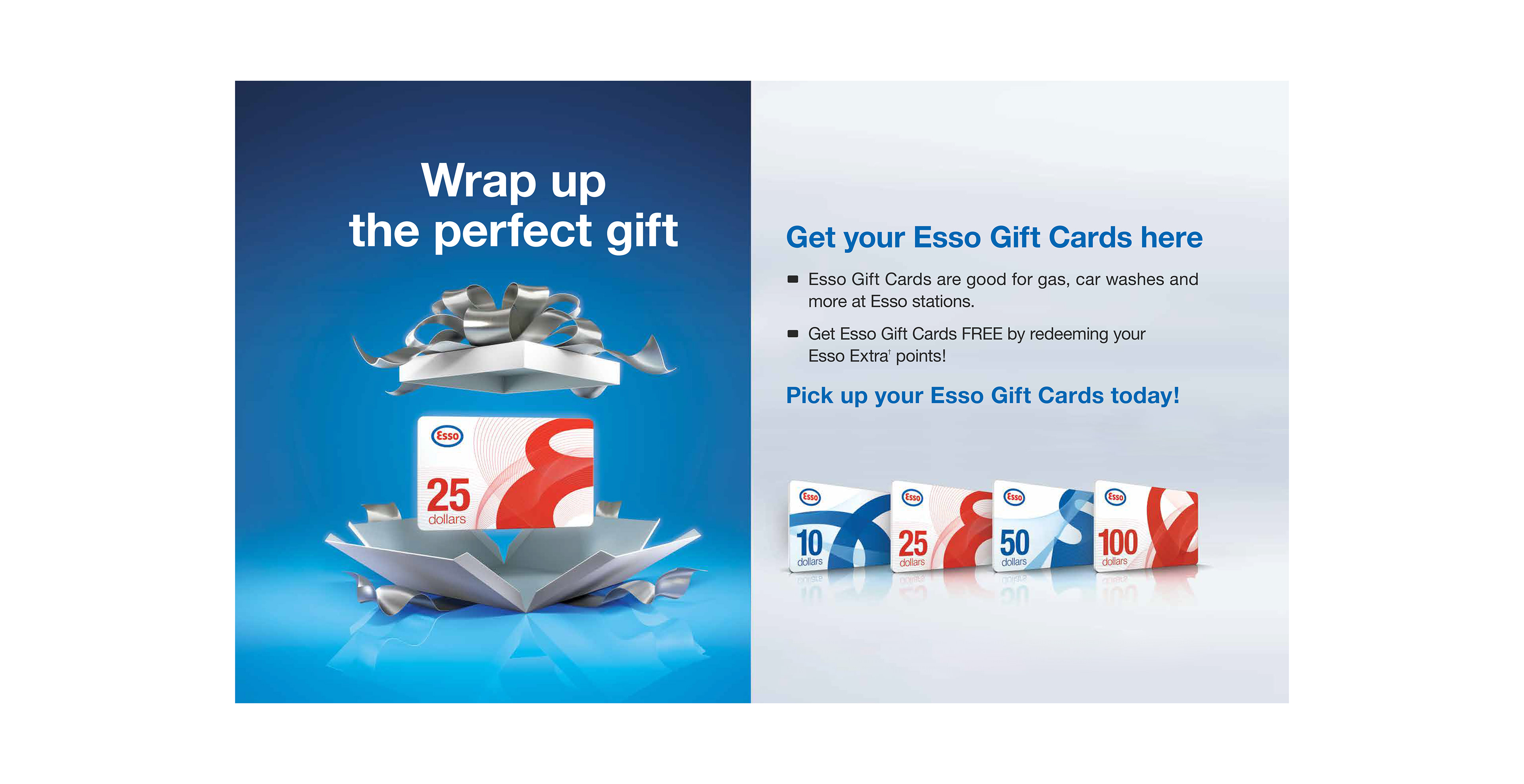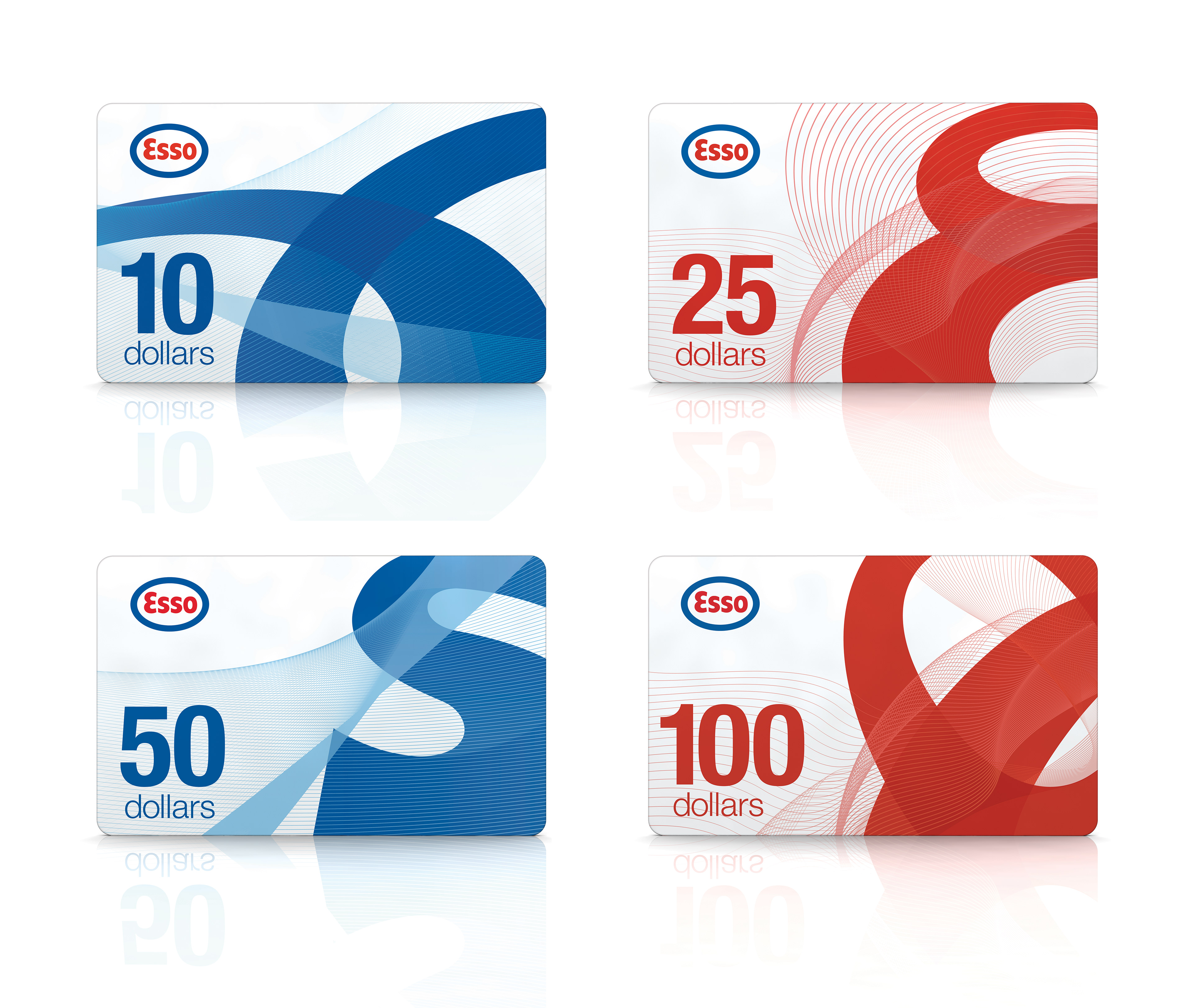 We created a suite of gift cards for Esso which graphically highlights different sections within their logo: Outer oval = $10 // "E" = $25 // "S" = $50 // "O" = $100